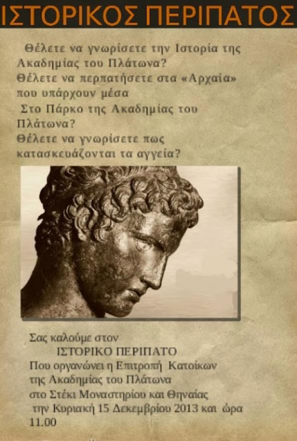 Σας καλούμε στον ιστορικό περίπατο που οργανώνει η Επιτροπή Κατοίκων της Ακαδημίας του Πλάτωνα στο Στέκι Μοναστηρίου και Θηναίας την Κυριακή 15 Δεκεμβρίου 2013 και ώρα 11:00.
